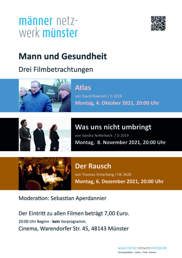 In der bereits 5. Auflage der Filmreihe des männernetzwerk münster in Kooperation mit dem Cinema geht es um ein gesellschaftlich nach wie vor tabubehaftetes Thema: „Männer und Gesundheit“ Zwischen Oktober und Dezember zeigen wir drei Filme, in denen Sie erste Zugänge zu dem Thema finden können. Nach jedem Film möchten wir uns für ca. 20…